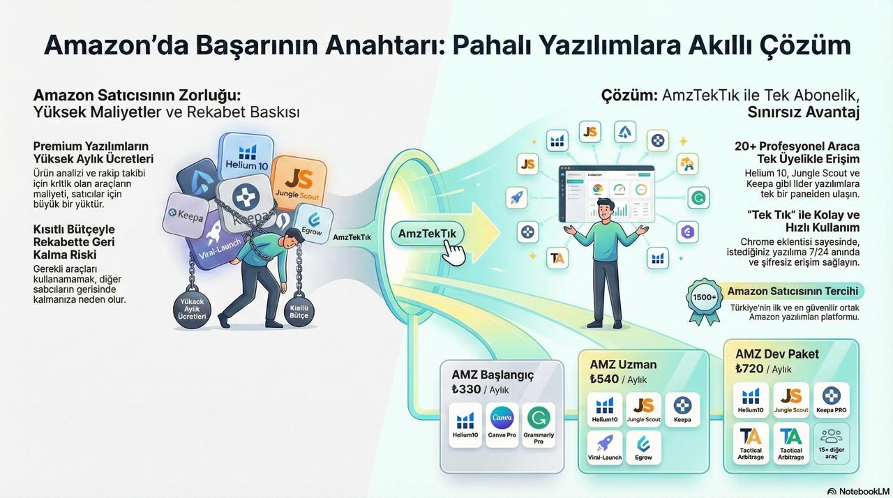 Bu ihtiyaçların her biri için ayrı bir yazılım kullanmak, aylık yüzlerce hatta binlerce liralık maliyet anlamına gelir. Helium 10, Jungle Scout, Keepa, Viral Launch gibi araçlar sektör standardı olsa da, hepsine ayrı ayrı abone olmak çoğu satıcı için sürdürülebilir değildir.